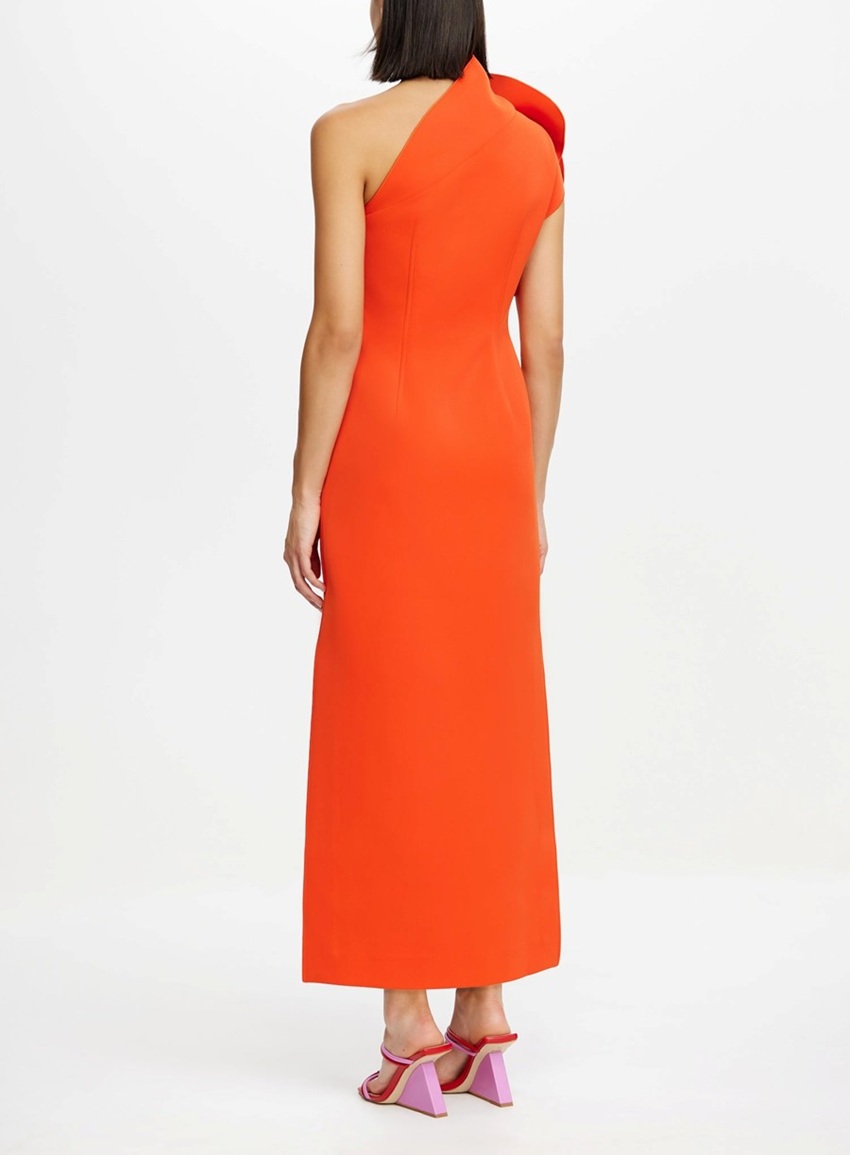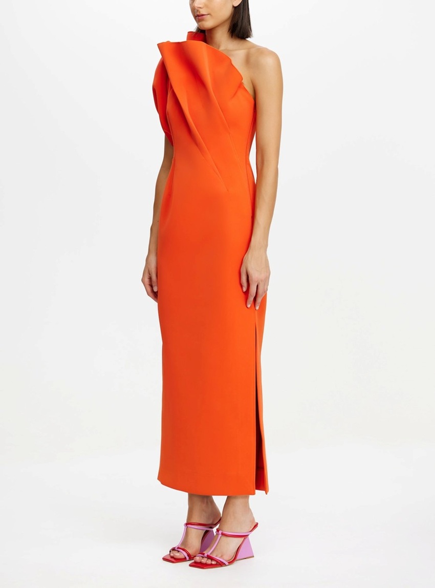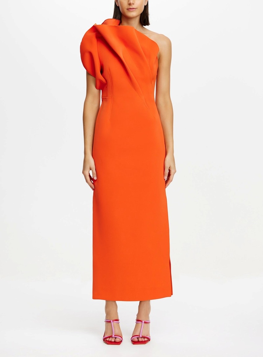 -The Hawkley midi dress features an asymmetrical one-shoulder neckline with sculptural pleating adding volume and dimension through the bodice, crafted in a rich, vibrant hue, and structured bonded fabrication.